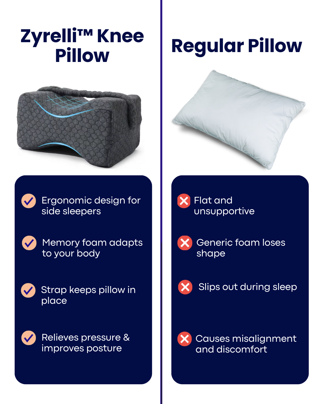 The Zyrelli™ Knee Pillow is designed for side sleepers who want better alignment, less pressure, and deeper rest. Crafted from premium memory foam with an adjustable strap, it stays in place all night — so you can finally wake without hip, knee, or back pain.